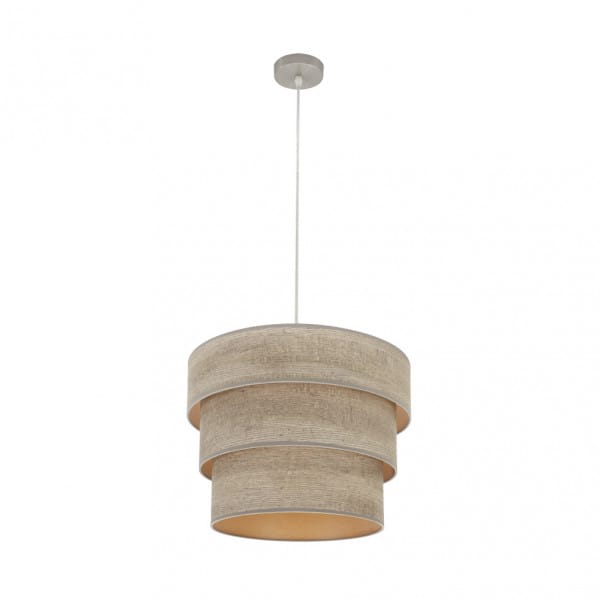 Colgante de la serie SMILE de color NIQUEL/MADERA GRIS de 40 centímetros de diámetro. Realizado en metal y textil. Posee un portalámparas E27. Bombilla no incluida. Su pantalla está formada por tres cuerpos dispuestas por tamaños descendentes de mayor a menor, resultando una composición de diseño muy original y moderno, recordando a la madera, ideal para decorar en salones, comedores y espacios de trabajo haciéndose el centro de la estancia que ilumina. Sus dimensiones son regulable en altura, de 57<,120x40x40 centímetros. En esta serie podemos encontrar los colgantes de 50 y 40 centímetros de diámetros, sobremesas, apliques y pies de salón, todos realizados en tejidos que nos recuerdan a madera clara, madera oscura, madera gris, óxido y madera negra.