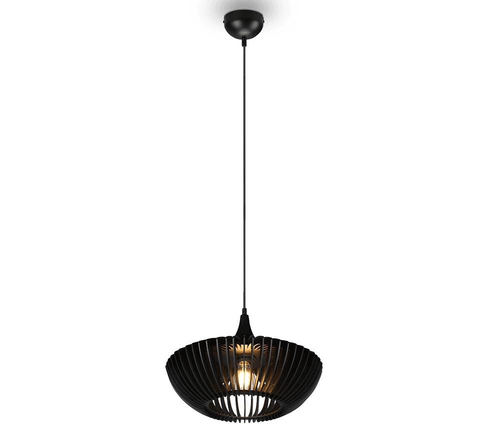La lámpara colgante COLINO irradia gracia y elegancia con su pantalla de listones de madera. Su llamativo diseño curvado crea una atmósfera luminosa cálida y acogedora y enriquece con gusto sus locales y su estilo interior. La madera negra en combinación con el metal en negro mate tiene un efecto armonioso y pone acentos modernos. Para una iluminación que ahorre energía, se recomienda utilizar un iluminante LED. Son una alternativa óptima a las lámparas halógenas convencionales y ofrecen una gran calidad de luz y un ahorro energético de hasta el 80%. Además, las lámparas LED le ayudan a beneficiarse de una larga vida útil, una baja generación de calor y, al mismo tiempo, protegen el medio ambiente.
