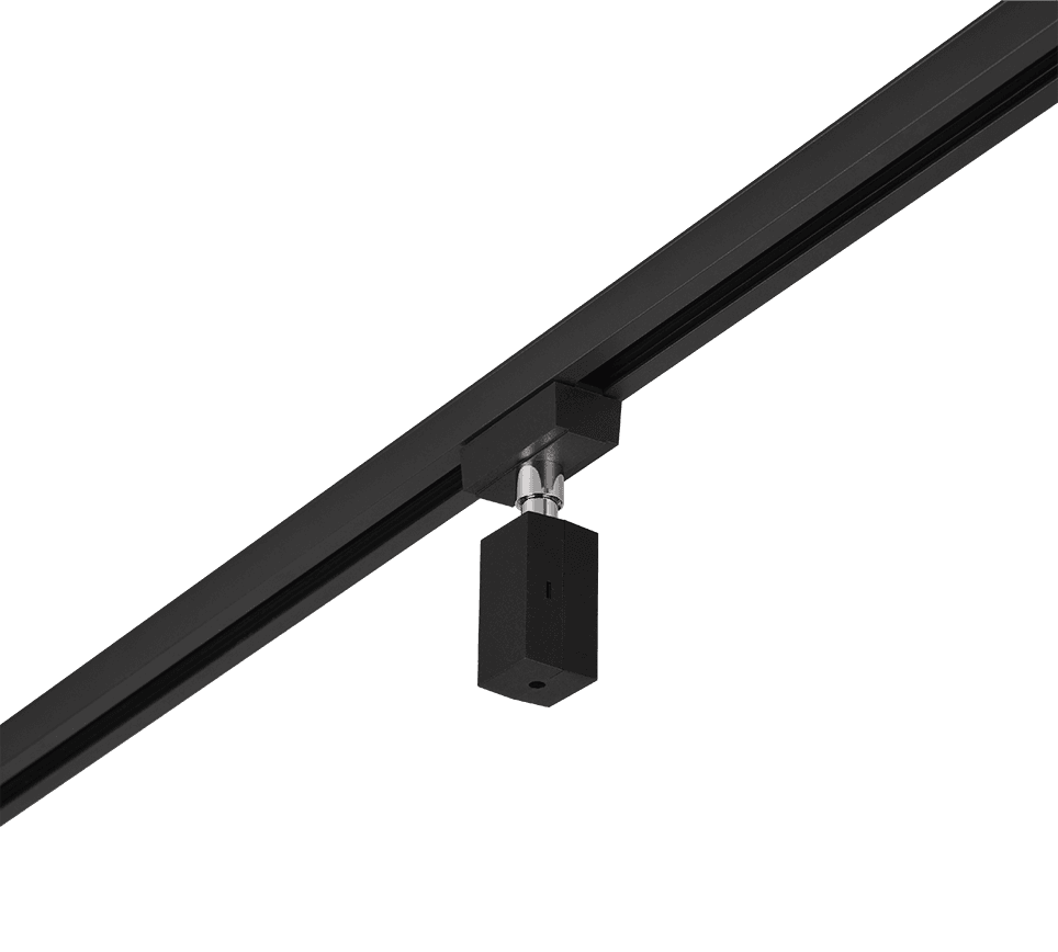 El adaptador colgante es uno de los numerosos componentes del sistema de carriles DUOline. El sistema de 2 fases es extremadamente flexible y ofrece numerosas opciones para un diseño de iluminación personalizado. El adaptador para luminarias colgantes permite integrar luminarias colgantes convencionales en el sistema de carriles DUOline y ajustar su altura individualmente. Las luminarias colgantes deben tener la clase de protección II y no deben superar una potencia de 60 W y un peso de 2 kg. El adaptador colgante está diseñado a juego con otros componentes del sistema DUOline en negro mate.